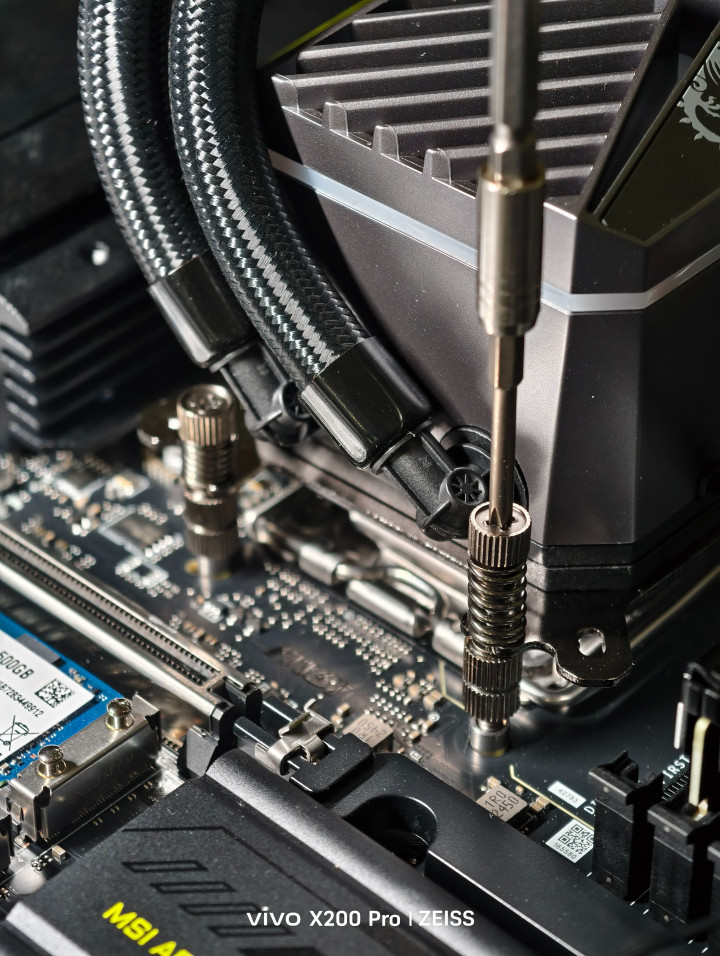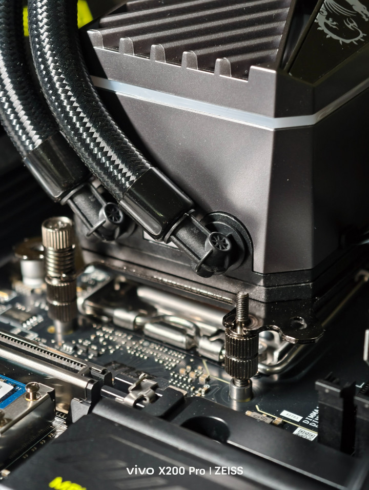 安装的便利性实在很高,在AMD主板底座上好四个螺丝,将水冷头对准四个螺丝口后拧上弹簧螺丝,完事!