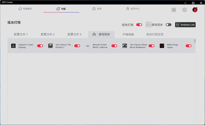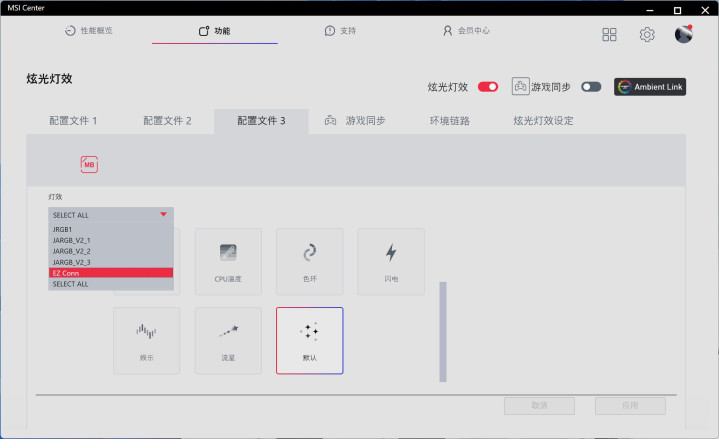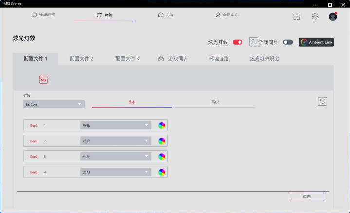 通过MSI CENTER软件能对水冷灯效、灯光进行多种设定,精准到水冷头、每个风扇的颜色都能单独精确控制,也能根据游戏同步,充分满足喜欢玩光污染的你。