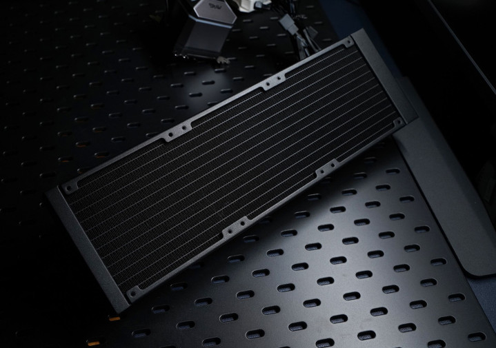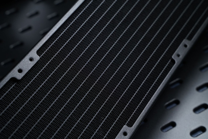 冷排尺寸为394.4 x 119.6 x 27mm,鳍片排列整齐无变形,内置12条加宽水道,每英寸鳍片数达到了20,在保持27毫米厚度的正常尺寸下依旧能增加25%的水流量。
