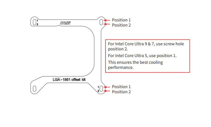 LGA1851偏移扣具带有两个孔位,2是用于发热量更大的Ultra9~7系列,1孔位用于Ultra5系列,毕竟两者核心面积与发热位置有些许不同,有了偏移扣具能让水冷头更加精准接触发热源,大大提升散热效率。