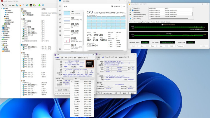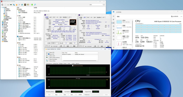 使用R9 9950X3D的CPU,开启AID64进行单选FPU烤机12分钟测试,在室温26℃的环境下测出的CPU表面温度是77℃,核心与CCD温度是77~74℃左右,此时CPU功耗为180W。